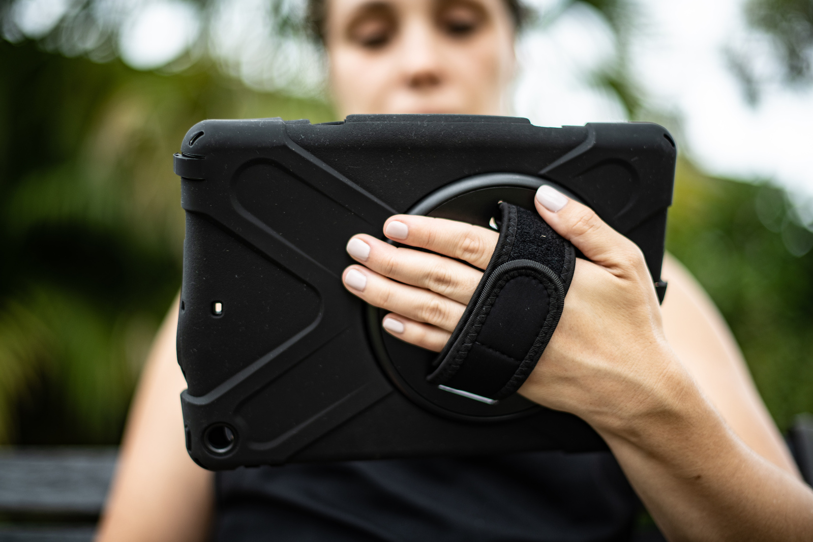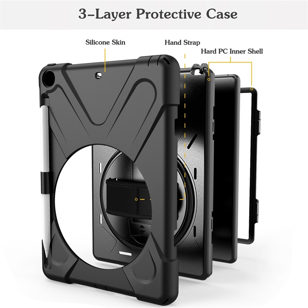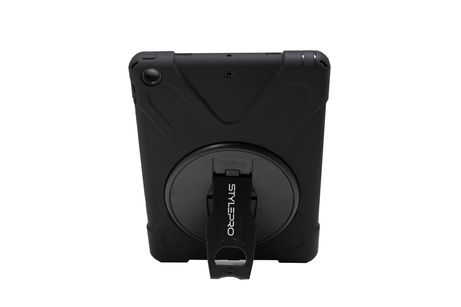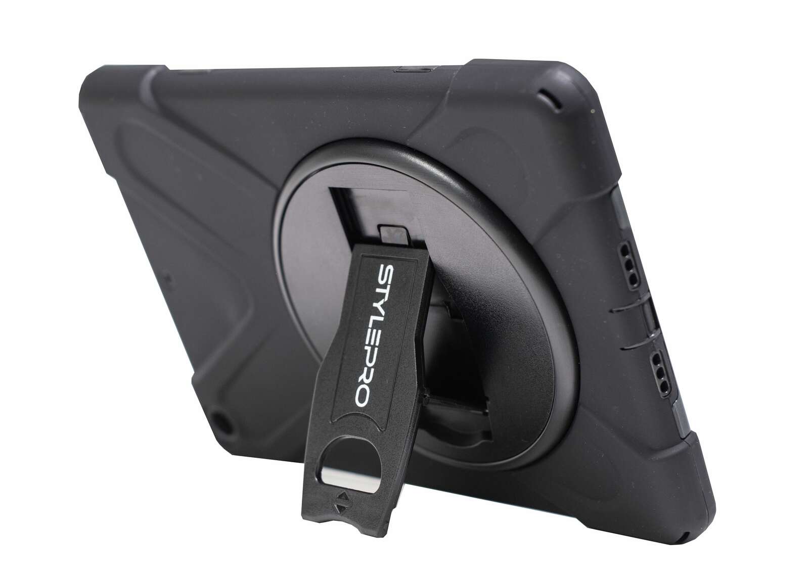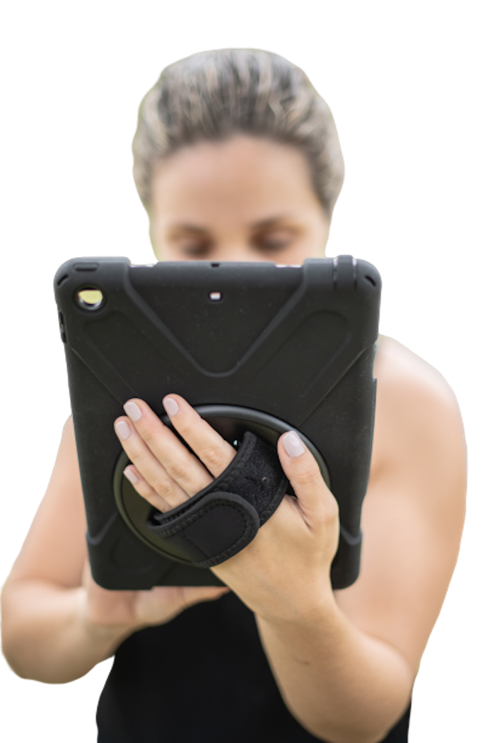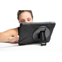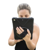 The case stand and strap can rotate 360° allowing you to hold the iPad in any direction. The case is made from shock absorbing layers and all ports and camera are accessible.
