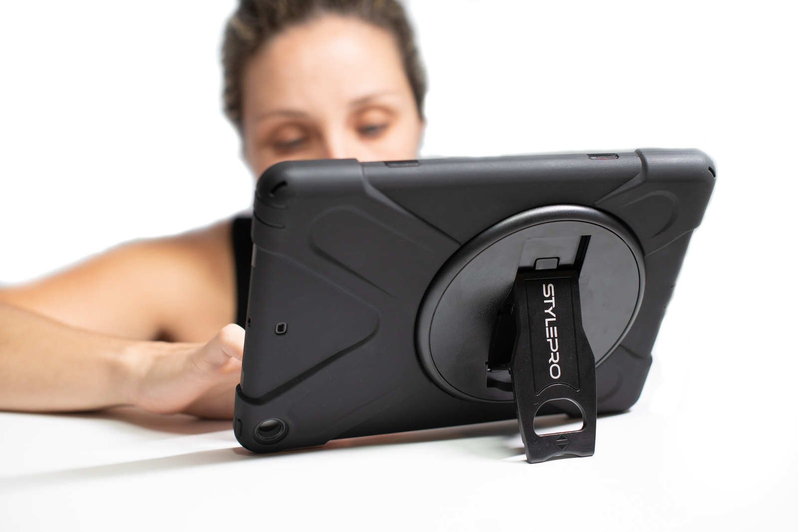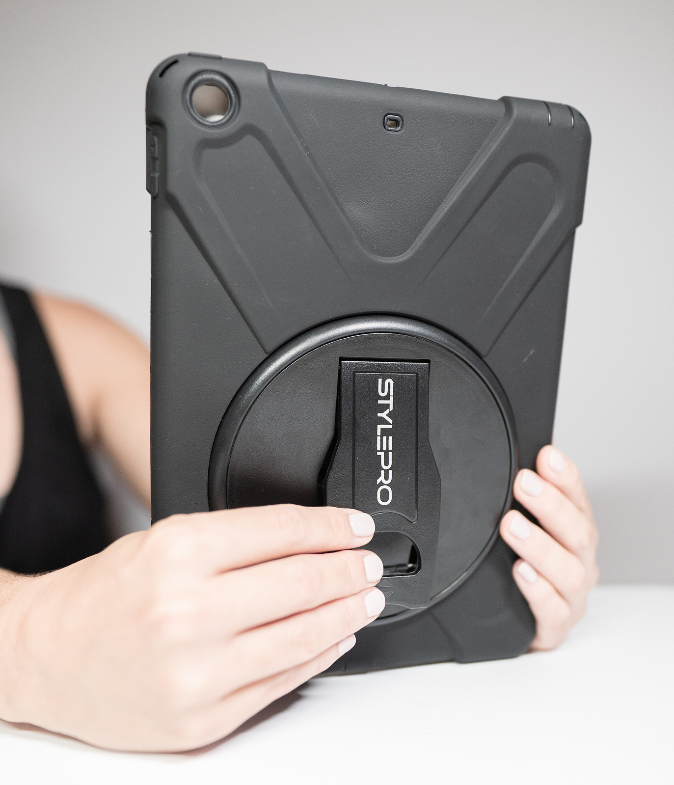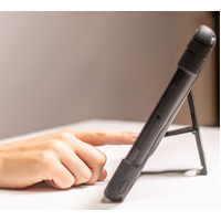 The Shockdrop case offers a rotating kickstand that folds back, and a comfortable hand strap for secure grip.