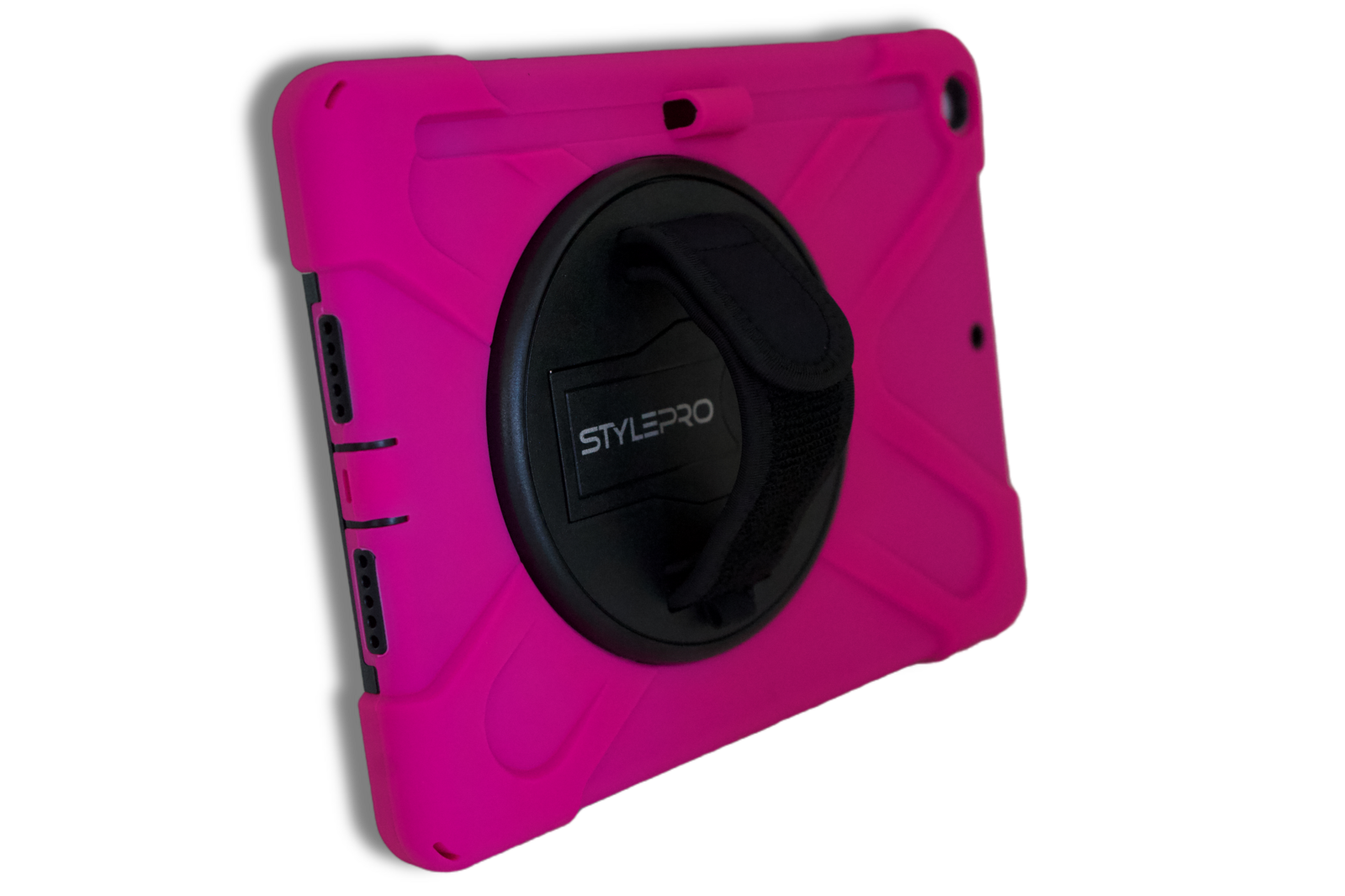 The case stand and strap can rotate 360° allowing you to hold the iPad in any direction. The case is made from shock absorbing layers and all ports and camera are accessible.