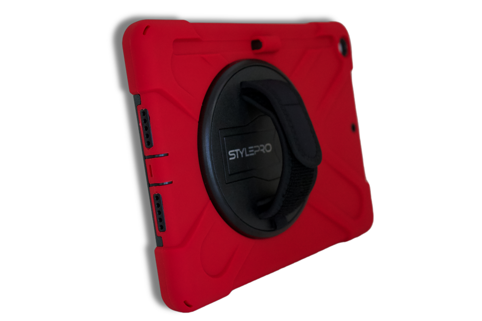 The case stand and strap can rotate 360° allowing you to hold the iPad in any direction. The case is made from shock absorbing layers and all ports and camera are accessible.