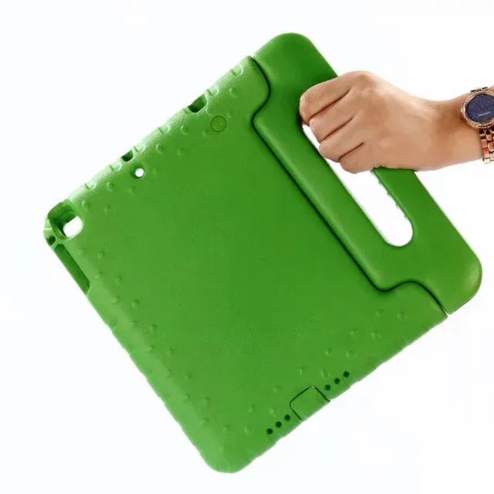 Made from durable EVA foam material. The Kid Friendly Durable Handle Case is able to protect the iPad if dropped. The built-in handle allows the iPad to be carried around safely and easily in the case. Cut-outs in the case design allow for the buttons and ports to be easily accessed.