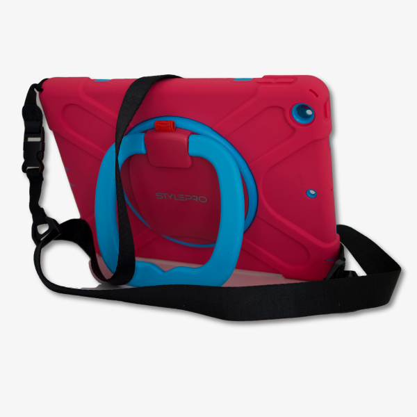 The tough shockproof case offers a rotating kickstand that folds back, allowing you to watch videos or read in landscape or vertical position. The stand doubles as a handle to cary your iPad, ideal for kids who bring their iPad everywhere.