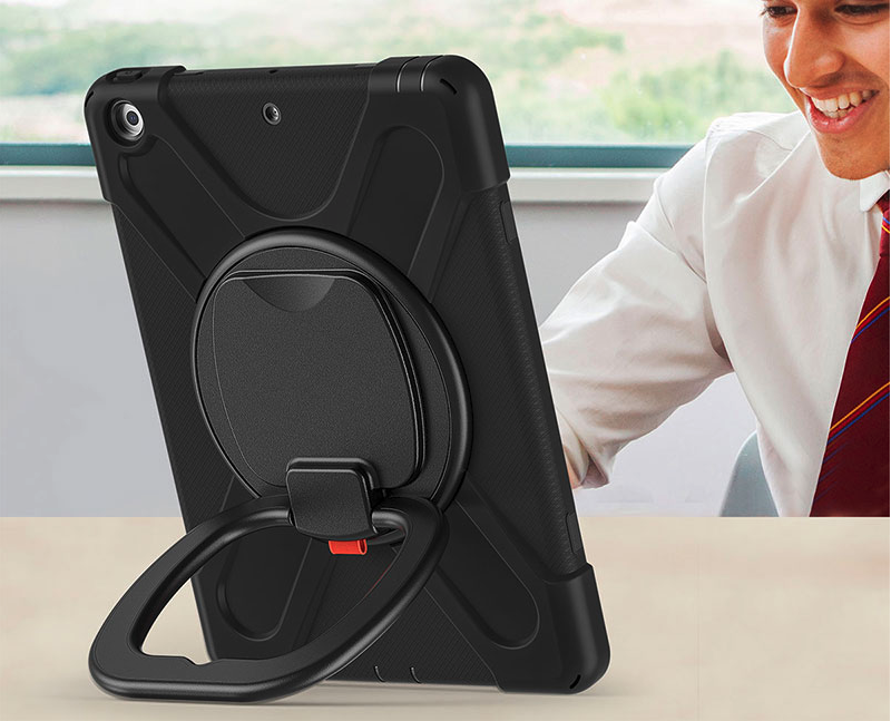 The tough shockproof case offers a rotating kickstand that folds back, allowing you to watch videos or read in landscape or vertical position. The stand doubles as a handle to cary your iPad, ideal for kids who bring their iPad everywhere.
